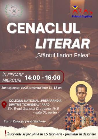 Cercul Redacție presă / Radio -Tv de la Palatul Copiilor Arad în colaborare cu ASCOR Arad, anunță lansarea Cenaclului literar „Sfântul Ilarion Felea” — un proiect dedicat elevilor pasionați de literatură și și scriere creativă. Inițiativa se adresează elevilor cu vârste între 14 și 18 ani și are scopul de a oferi un cadru prietenos în care creativitatea, lectura și exprimarea publicistăcă să fie încurajate și dezvoltate. Întâlnirile au loc în fiecare miercuri, între orele 14:00 și 16:00, la Colegiul Național „Preparandia Dimitrie Țichindeal” Arad (Str. B-dul General Dragalina, Nr. 6) — sala 01, parter. Programul reunește activități specifice unui cenaclu literar: lecturi, discuții critice și ateliere de creație literară. Inscrieri până în 15 februarie.